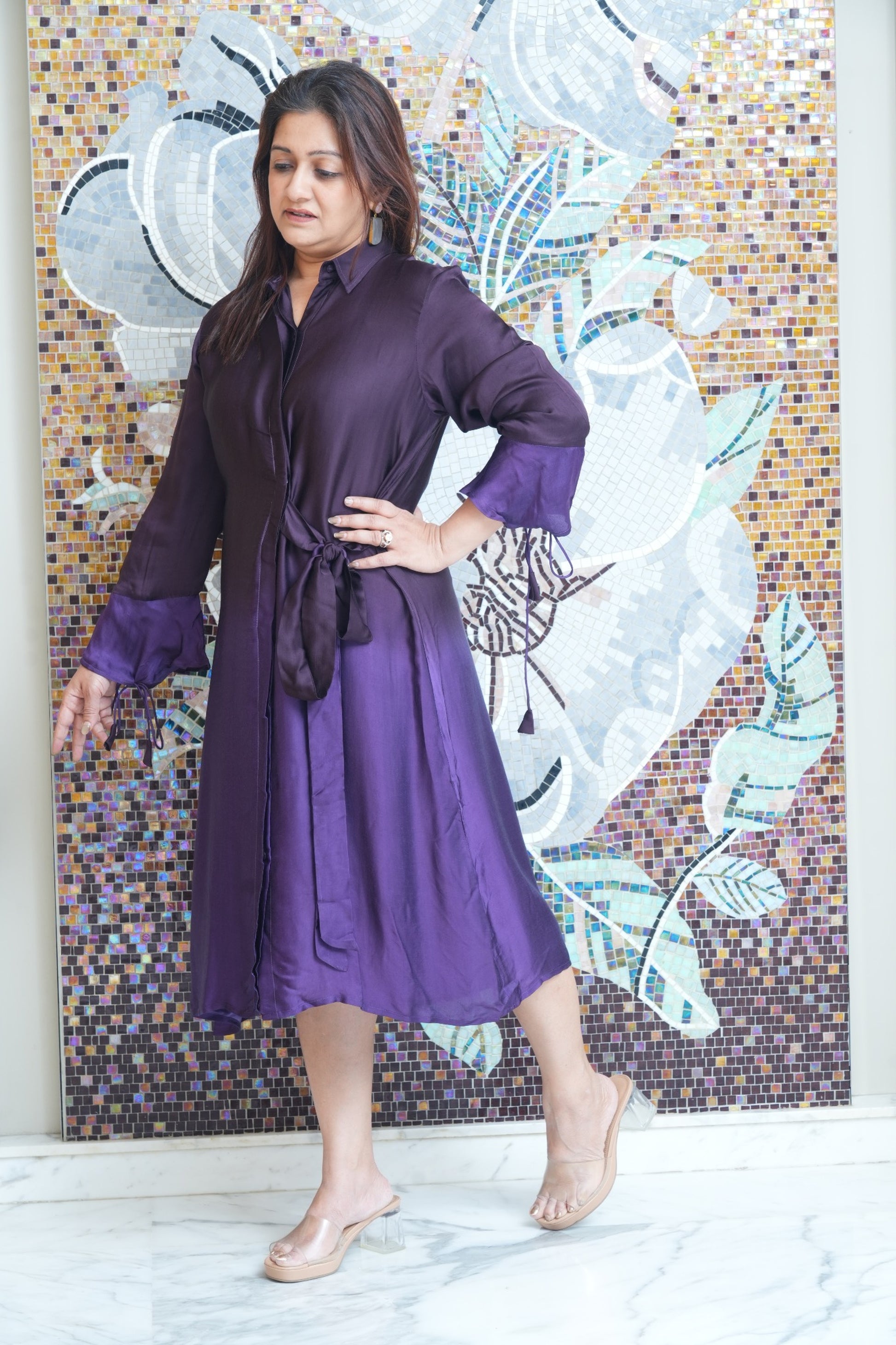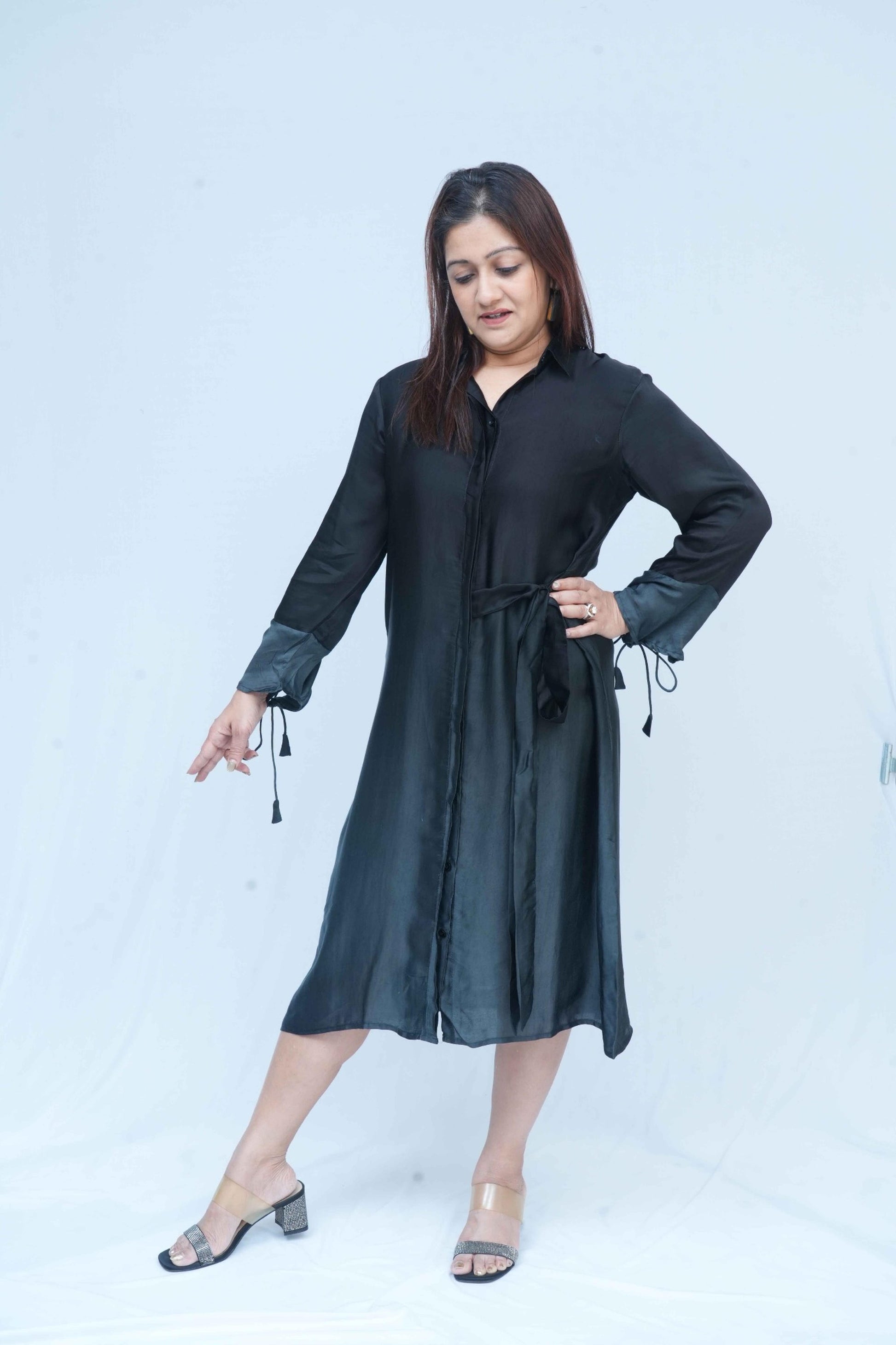 Chic, understated, and endlessly versatile — this black shirt dress is your go-to for effortless elegance. Crafted in a soft, silk fabric with a subtle sheen, it features a relaxed silhouette that drapes beautifully on the body. The tonal cuffs and tie-up detail at the sleeves add subtle contrast and charm, while the side waist tie cinches the shape for a flattering finish. A perfect pick for day-to-night transitions.